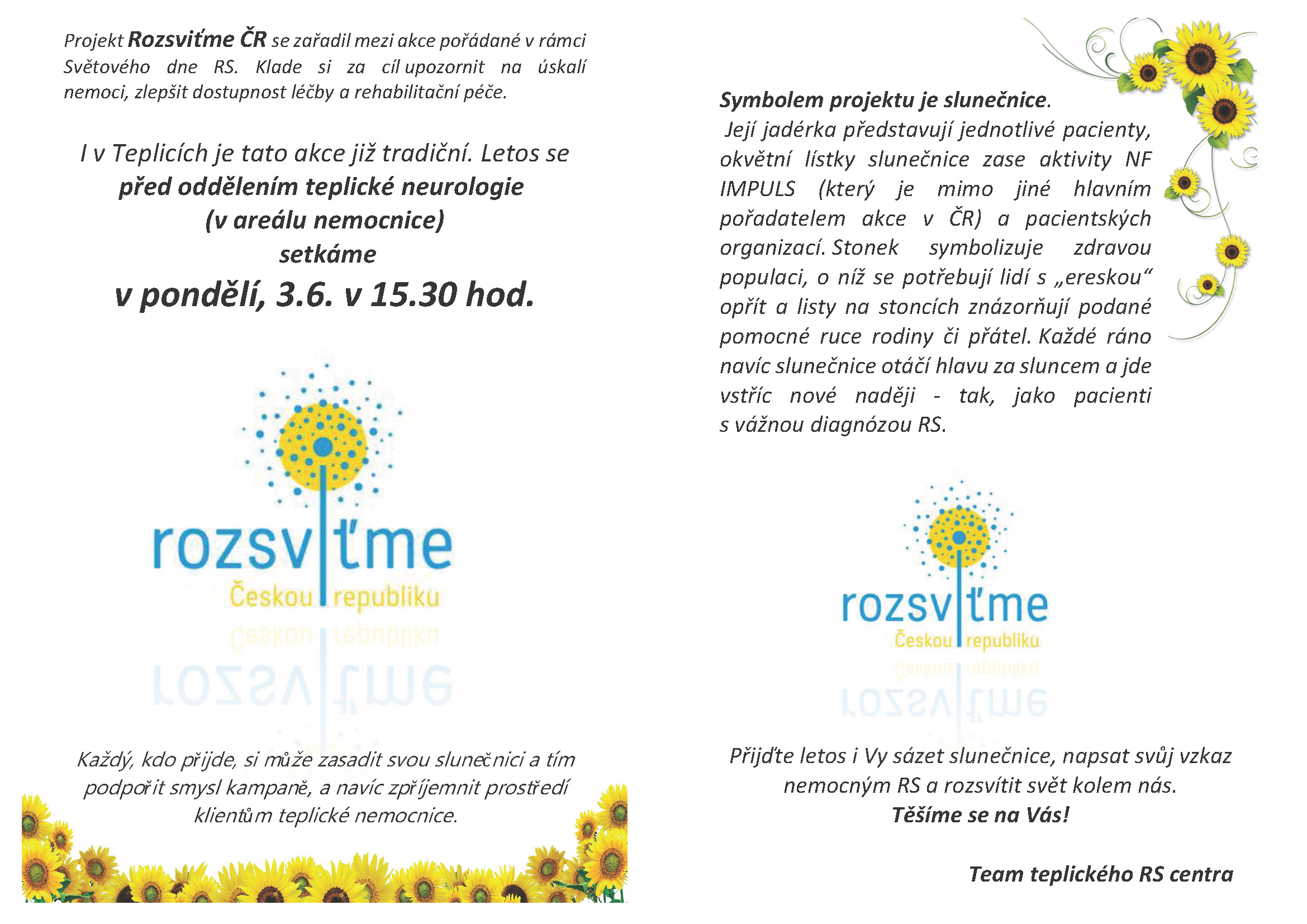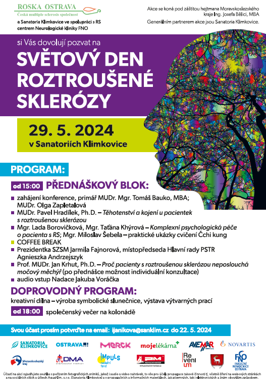 • Konference: O roztroušené skleróze (ne)jen pro rodinu • Podzimní VOZKA: nové horizonty a zdroje inspirace • Rok a půl utekl jako voda • Roztroušenou sklerózu na sobě poznáte. Toto jsou signály, kterými tělo volá o pomoc • Lidé s roztroušenou sklerózou potřebují pravidelnou péči. Najdou ji v Žirči • Víkendový seminář pomohl pacientům s roztroušenou sklerózou • Nemoc připravila Lucii z Nymburka o zrak. Sbírka má pomoci jí i dceři Emmě •