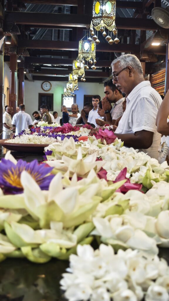 Další kroky nás zavedly do chrámu Buddhova zubu. Zde se psala historie ostrova od uložení svaté relikvie až po novodobé dějiny a nezávislost. Proto nebylo překvapující, že zde proudily davy turistů, které se mísily mezi další místní modlící se.