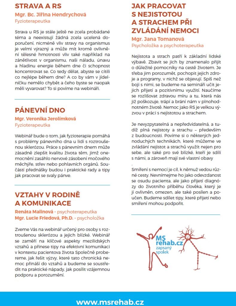 Registrace: Pro zaslání odkazu na vysílání je potřeba se zaregistrovat na každý webinář zvlášť. Registrujte se zde: www.msrehab.cz