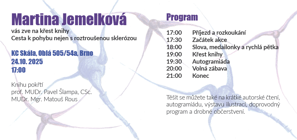 Martina Jemelková Vás zve na křest knihy, který proběhne 24. října od 17. hodin v KS SKÁLA, Oblá 505/54a, Brno. Knihu pokřtí prof. MUDr. Pavel Šlampa a MUDr. Mgr. Matouš Rous.