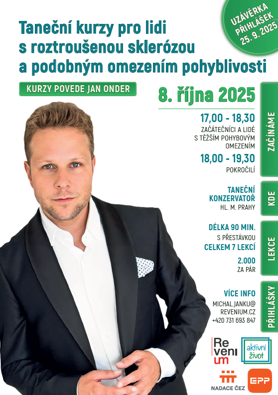 Pro velký úspěch od 8. října 2025 poběží v Praze další kolo tanečních! Tanečník Jan Onder, kterého mnozí znáte například ze StarDance, připravil ve spolupráci s Reveniem, sedm lekcí tanečních kurzů pro lidi s roztroušenou sklerózou a podobným omezením pohyblivosti. V 17 hodin začínají začátečníci a lidé s těžším tělesným postižením. V 18 hodin začínají tančit pokročilí.