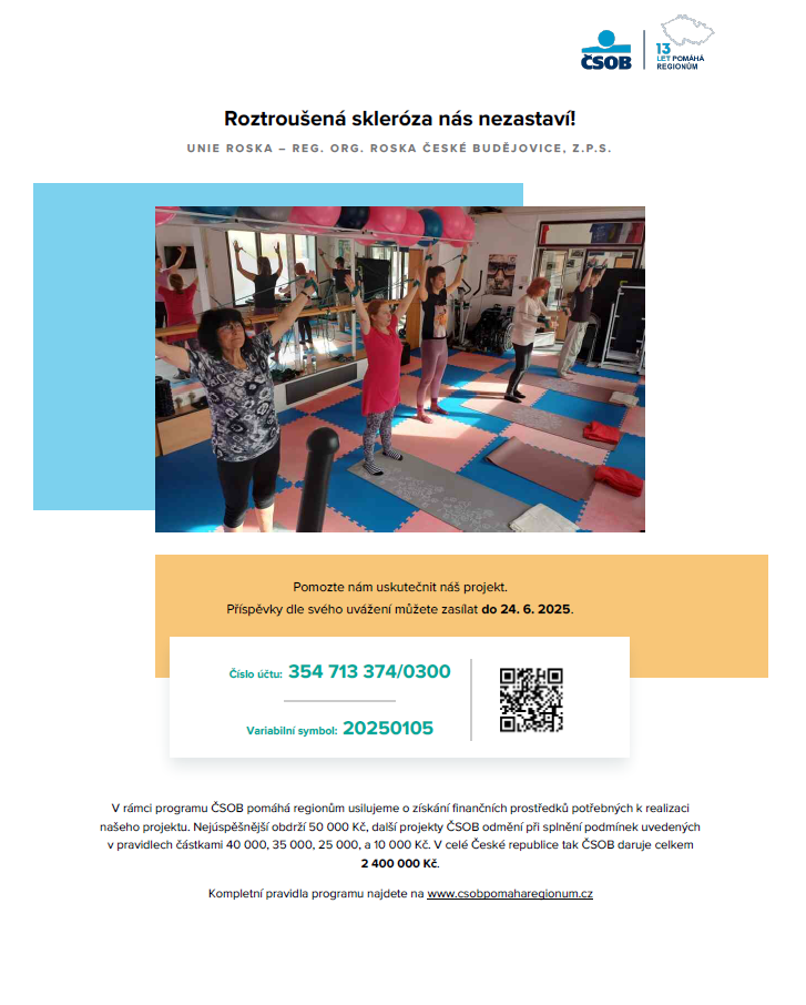 Přejeme krásný den z Rosky ČB a dělíme se o velkou radost – náš projekt „Roztroušená skleróza nás nezastaví!“ byl vybrán mezi finalisty ČSOB Pomáhá regionům! A teď potřebujeme vaši pomoc. Naším cílem je pořídit cvičební pomůcky pro lidi s roztroušenou sklerózou. Pohyb pro nás není luxus – je to léčba, radost a nezávislost.